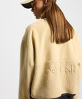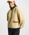 Vesten er fremstillet af certificerede genanvendte materialer og består af blød polar fleece med ekstra fyldige paneler på ryggen og lommerne, som tilfører volumen og tekstur. Den lette vævning ved kraven og nederste kant skaber en elegant kontrast, der giver vesten et moderne udtryk. De skrå sidelommer med trykknapper er praktiske til opbevaring, mens den justerbare elastiksnor ved kanten gør det muligt at tilpasse pasformen efter behov.