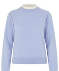 Sweateren har feminine ruffles ved halsudskæringen og et klassisk crewneck-snit, der gør den både tidløs og moderne. Den lyse blå farve er perfekt til foråret og sommeren, og den bløde kvalitet sikrer optimal komfort hele dagen. Designet er nemt at style til både hverdag og fest.
