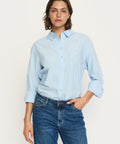 Skjorten er fremstillet i en bæredygtig blanding af 50 % modal (TENCEL™) og 50 % bomuld, som giver en blød og behagelig kvalitet med smukt fald. Designet byder på lange ærmer, rund halsudskæring, og en let A-formet pasform, der skaber et flatterende og luftigt udtryk.
